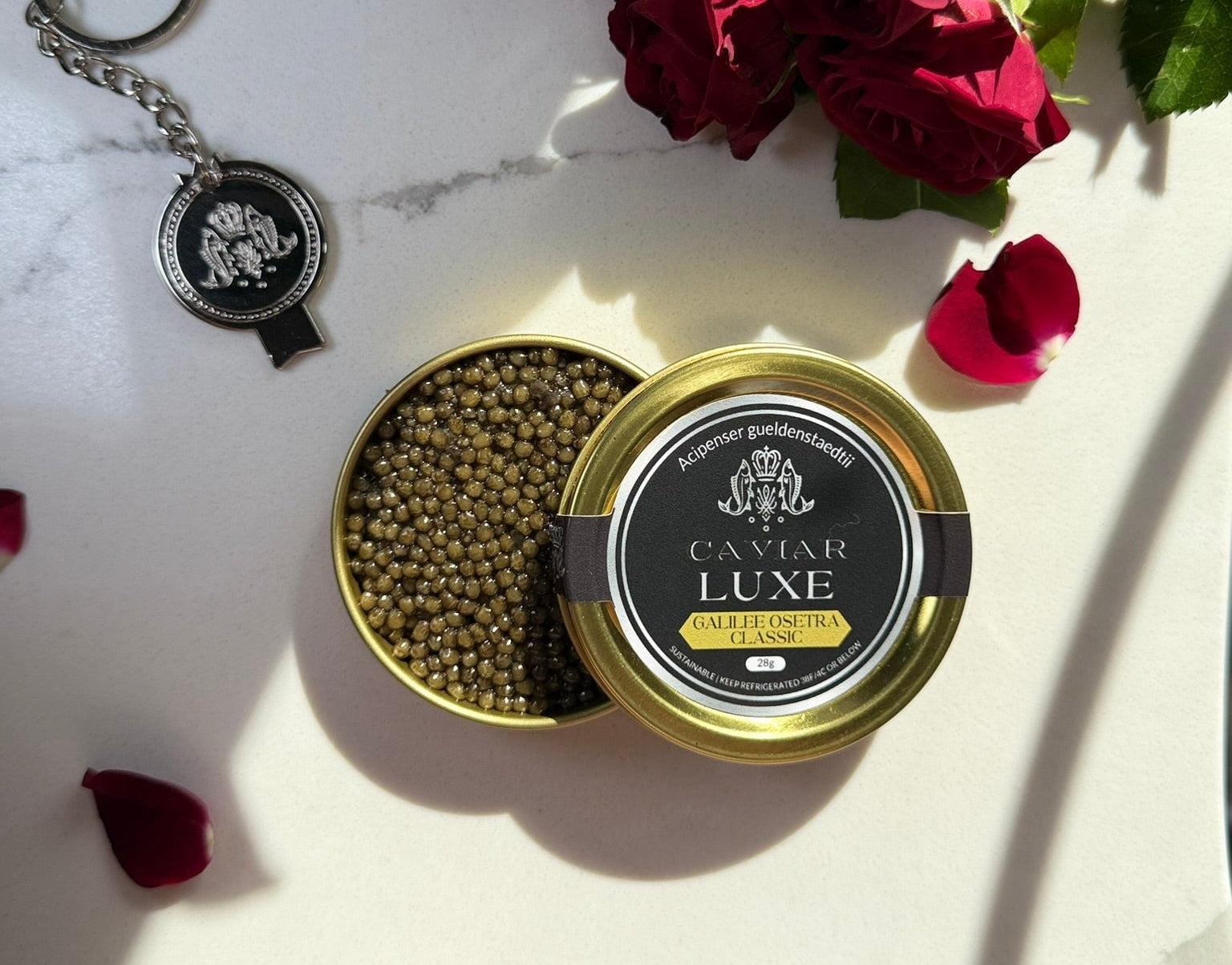 Galilee Osetra Caviar – premium Osetra sturgeon roe with rich, nutty flavor and smooth texture. Dark amber to golden pearls, reminiscent of wild-era caviar. Buy fresh Galilee Osetra Caviar online with free overnight shipping.